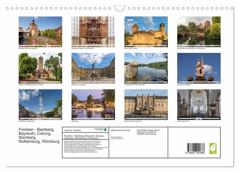 Sechs äußerst sehenswerte Orte der Region Franken zeigt dieser faszinierende Kalender: Bamberg, Bayreuth, Coburg, Nürnberg, Rothenburg und Würzburg.