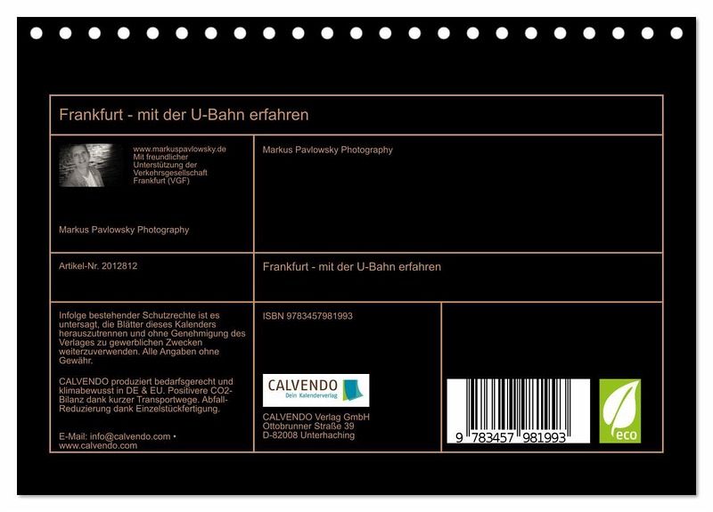 Der Fotograf Markus Pavlowsky zeigt mit diesem Wandkalender Frankfurt einmal anders. Auch in der "Unterwelt" Frankfurts, der U-Bahn und seinen schönen, architektonisch wertvollen Stationen, lassen sich wundervolle Dinge entdecken. Lassen Sie sich inspirieren.