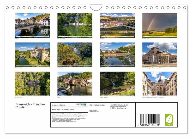Dieser faszinierende Kalender vom Reisefotografen Peter Schickert zeigt die ganze Vielfalt des äusserst sehenswerten Franche-Comté: Von malerischen kleinen Städten wie Ornans oder Lods zu spektakulärer Natur und Welterbestätten wie Besancon oder den Königlichen Salinen.