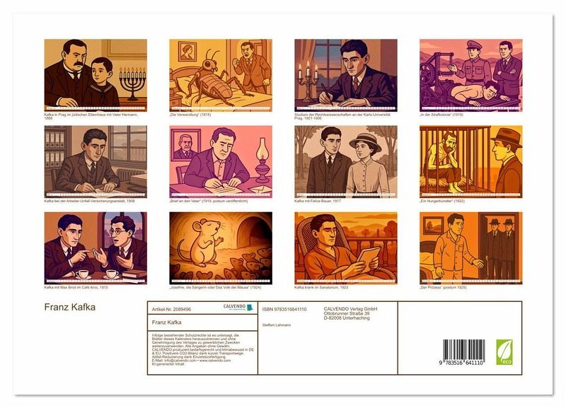 Der Kalender im Vintage-Comic-Stil ist eine Hommage an das literarische Erbe eines der einflussreichsten Autoren der Moderne: Franz Kafka. Jedes Bild, das Steffani Lehmann mit Unterstützung einer KI editiert hat, erzählt eine Geschichte - von seiner Kindheit über die tiefgründige Begegnung mit Verleger Max Brod bis hin zu den symbolträchtigen Szenen aus seinen Meisterwerken.