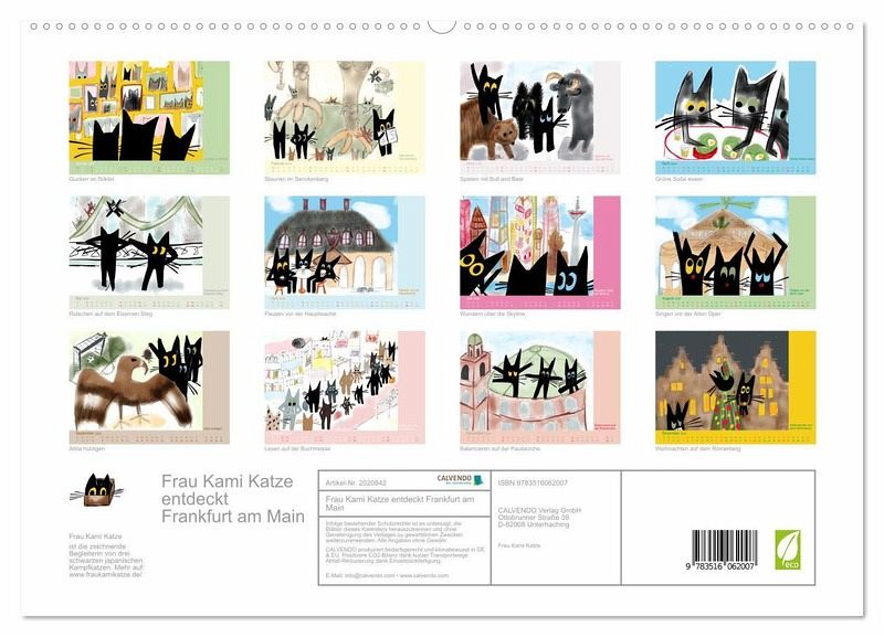 Dieser Jahreskalender begleitet mit viel Humor drei schwarze Katzen bei ihren atemberaubenden Abenteuern durch Frankfurt am Main. Oooooh, was die sich so alles trauen! Schauen Sie sich um, vielleicht treffen Sie die Drei bei einem neuen Abenteuer oder Frau Kami Katze in einem Café beim Zeichnen in Ihrer Stadt.