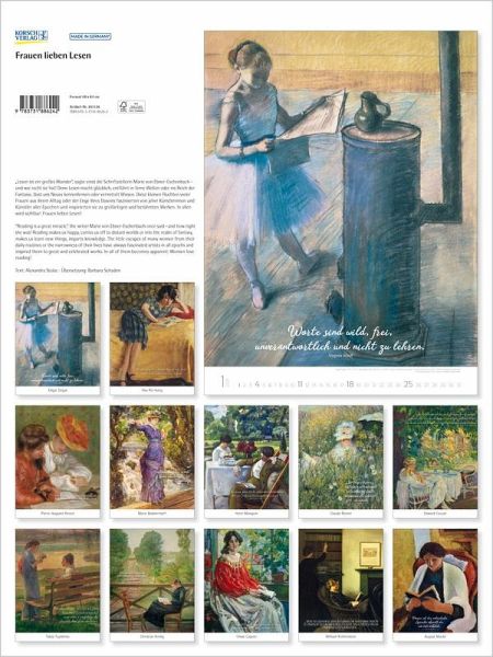 "Lesen ist ein großes Wunder", sagte einst die Schriftstellerin Marie von Ebner-Eschenbach - und wie recht sie hat! Denn Lesen macht glücklich, entführt in ferne Welten oder ins Reich der Fantasie, lässt uns Neues erfahren oder vermittelt Wissen. Diese kleinen Fluchten vieler Frauen aus dem Alltag oder der Enge ihres Daseins faszinierten von jeher Künstlerinnen und Künstler aller Epochen und inspirierten sie zu großartigen und berühmten Werken. In allen wird sichtbar: Frauen lieben Lesen!