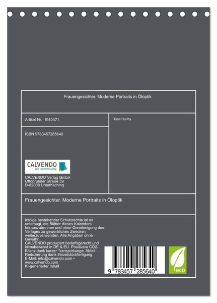 QUALITÄT - Hochwertiger Fotokalender mit 12 wunderschönen Motiven auf lichtbeständigem Bilderdruckpapier, robuste Spiralbindung.NACHHALTIG - deutliche Abfallreduzierung durch bedarfsgerechte Einzelstückfertigung, umweltfreundliches FSC-zertifiziertes Papier, Produktion in Deutschland, klimabewusste Logistik.PERFEKTES GESCHENK - Kalender für Freunde und Familie, für Kinder und Erwachsene, jung und alt, zu Weihnachten, Geburtstag oder zwischendurch.VIELFALT - Bildkalender in verschiedenen Formaten, z.B. DIN A5, DIN A4, DIN A3 sowie DIN A2. Ob Naturmotiv, Gemälde oder Fotos, ideal für ein persönliches Wohlfühlambiente.Ein kunstvoller Kalender mit ausdrucksstarken und modernen Frauenportraits im Stil der Ölmalerei. von Autor(in): Rose Hurley