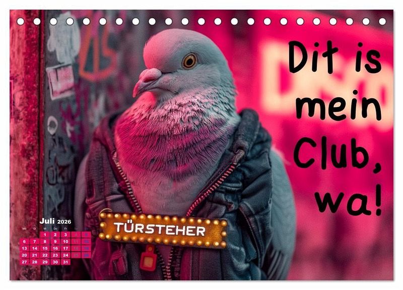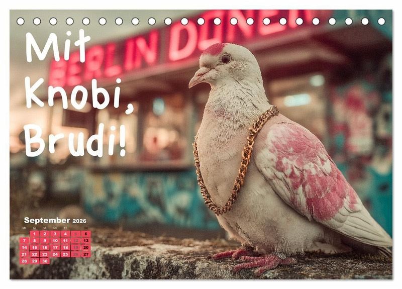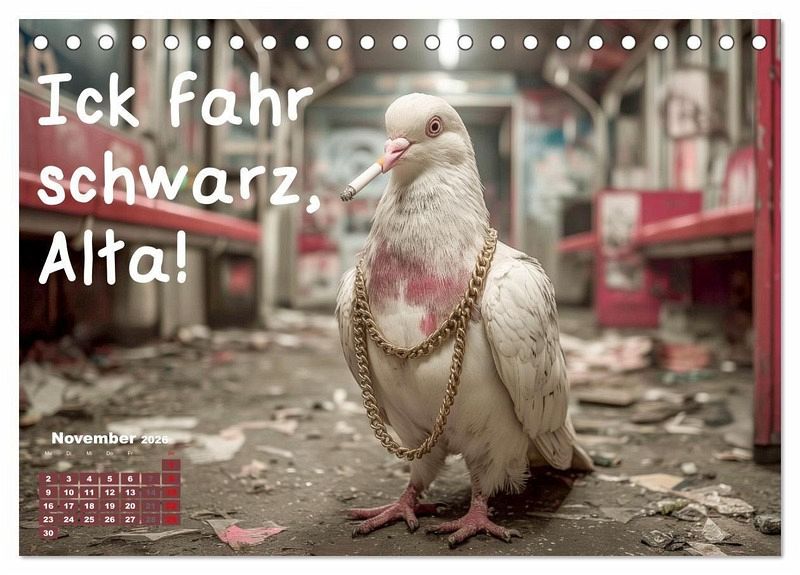 Freche Tauben aus Berlin bringen jeden Monat witzige Sprüche, Humor und echte Berliner Schnauze an die Wand. Dieser lustige Sprüchekalender zeigt Tauben mit Sonnenbrille, Kette, Mütze oder Hoodie in typischen Berliner Szenen wie Späti, Dönerbude, Club, Kreuzberg oder Weihnachtsmarkt. Tiere im Streetstyle und freche Sprüche sorgen garantiert für Lacher und machen den Fun Kalender zum Hingucker. Ob als Geschenk, originelles Mitbringsel für Berlin-Fans oder Überraschung für Freunde, Kollegen und Familie - dieser Berlin Kalender passt überall. Die Kombination aus Humor, Tieren, Dialekt und Mundart macht den Sprüchekalender einzigartig. Bilder mit KI generiert.