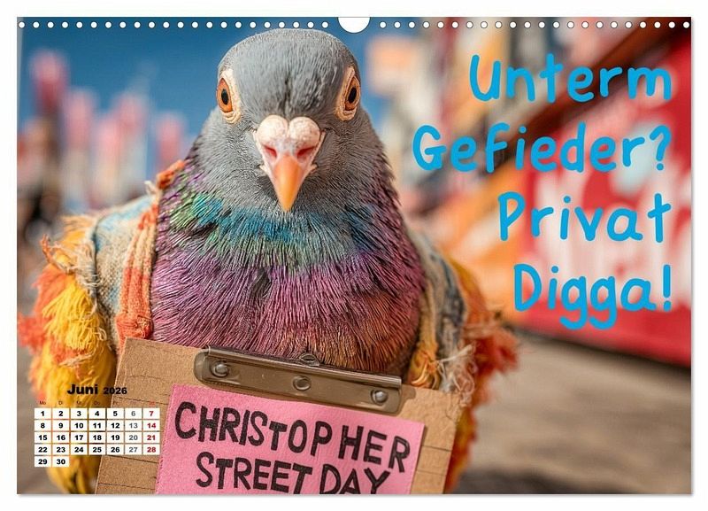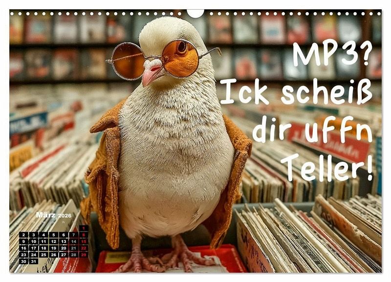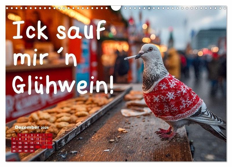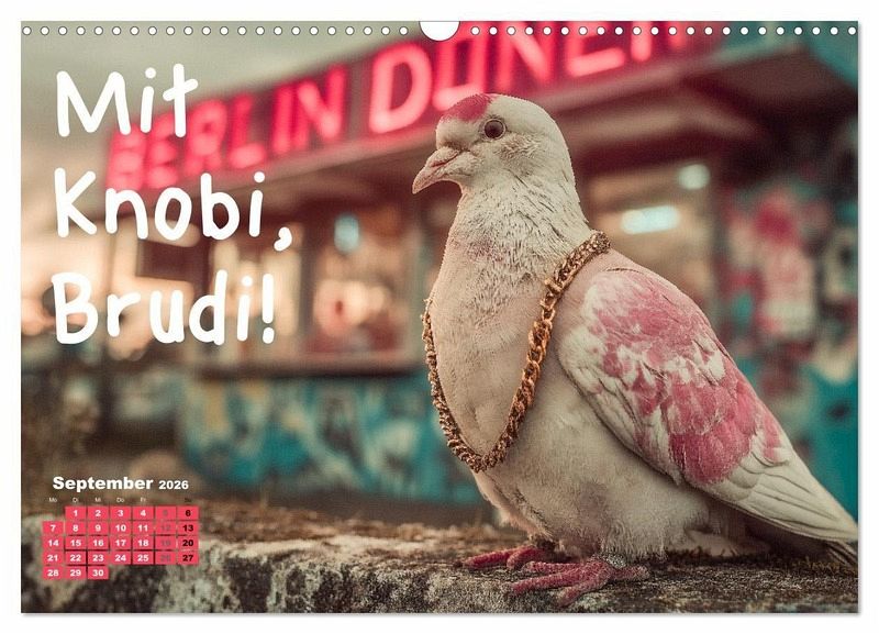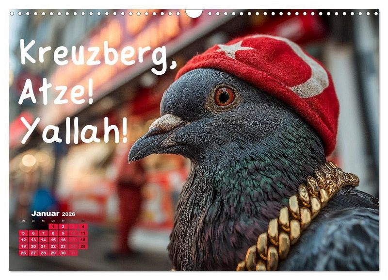 Freche Tauben aus Berlin bringen jeden Monat witzige Sprüche, Humor und echte Berliner Schnauze an die Wand. Dieser lustige Sprüchekalender zeigt Tauben mit Sonnenbrille, Kette, Mütze oder Hoodie in typischen Berliner Szenen wie Späti, Dönerbude, Club, Kreuzberg oder Weihnachtsmarkt. Tiere im Streetstyle und freche Sprüche sorgen garantiert für Lacher und machen den Fun Kalender zum Hingucker. Ob als Geschenk, originelles Mitbringsel für Berlin-Fans oder Überraschung für Freunde, Kollegen und Familie - dieser Berlin Kalender passt überall. Die Kombination aus Humor, Tieren, Dialekt und Mundart macht den Sprüchekalender einzigartig. Bilder mit KI generiert.
