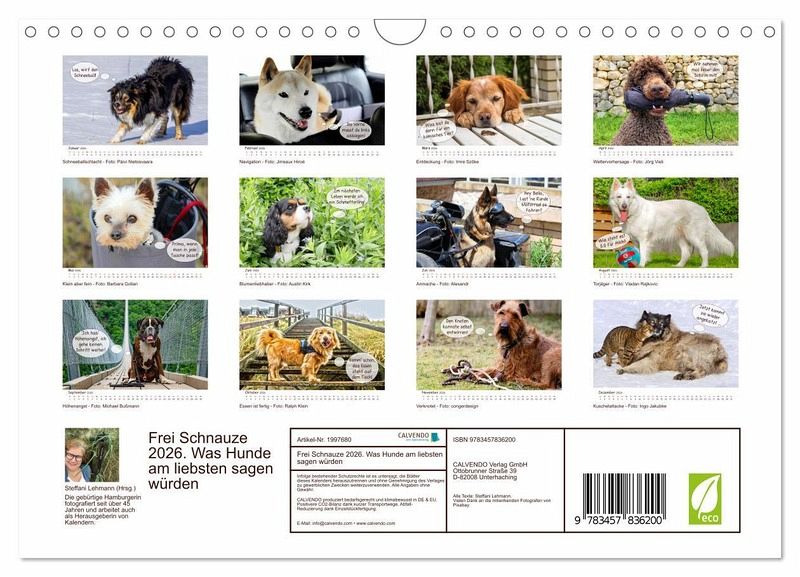 Wenn Hunde sprechen könnten, hätten sie sicher 'was zu sagen. Herausgeberin Steffani Lehmann vereint abwechslungsreiche Fotos von Hunden und hat ihnen dazu witzige Texte in die Schnauze gelegt. Ein origineller Kalender für alle Hundeliebhaber mit Humor!