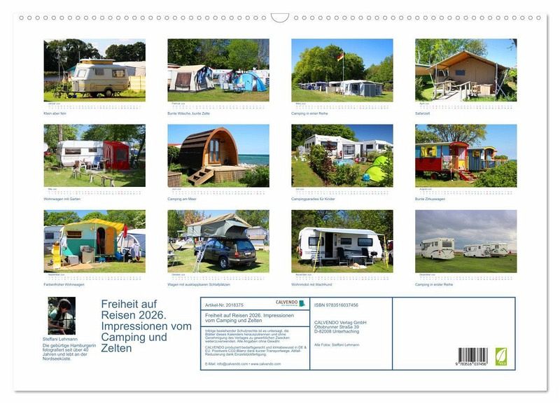 Immer mehr Reisende entdecken den Campingurlaub für sich. Rasten wo es gefällt, ist die Freiheit, die man im Alltag nicht mehr hat. Auf der anderen Seite steht die Gemeinschaft der Camper. Die verschiedenen Facetten des Campings zeigt Steffani Lehmann auf abwechslungsreichen Fotos in ihrem Kalender.
