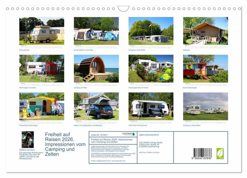 Immer mehr Reisende entdecken den Campingurlaub für sich. Rasten wo es gefällt, ist die Freiheit, die man im Alltag nicht mehr hat. Auf der anderen Seite steht die Gemeinschaft der Camper. Die verschiedenen Facetten des Campings zeigt Steffani Lehmann auf abwechslungsreichen Fotos in ihrem Kalender.