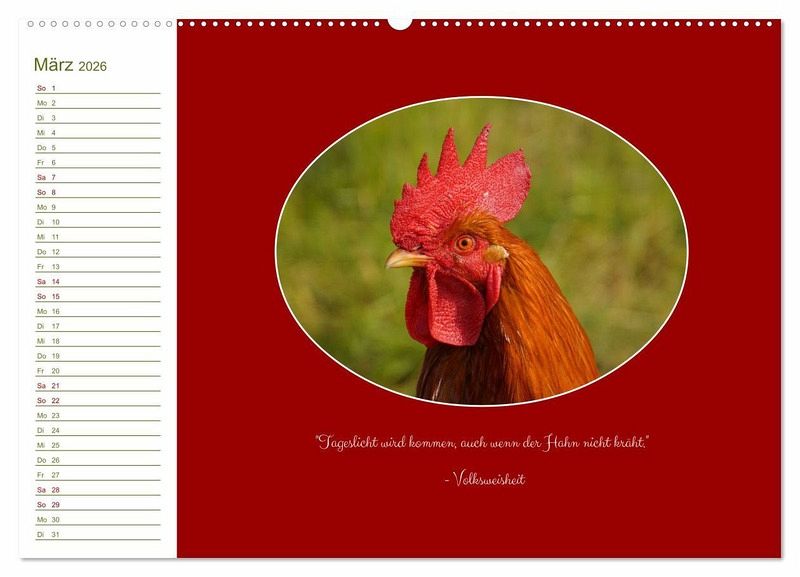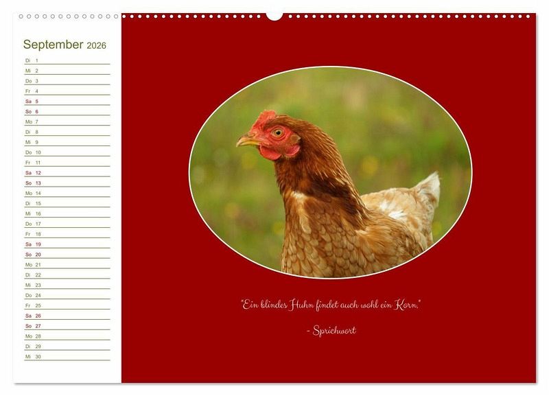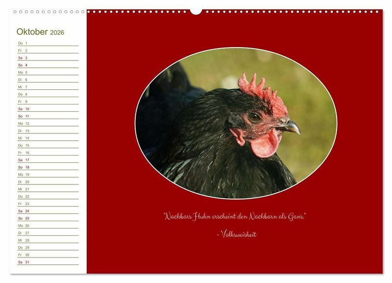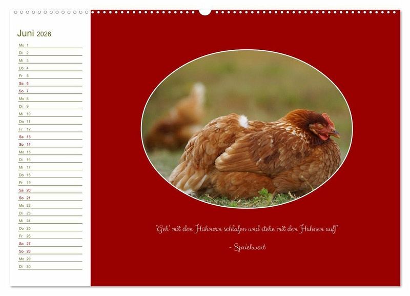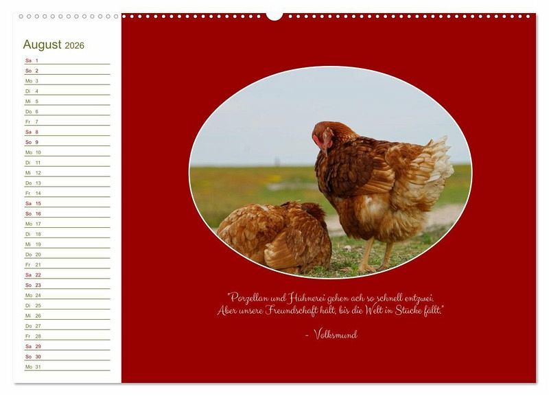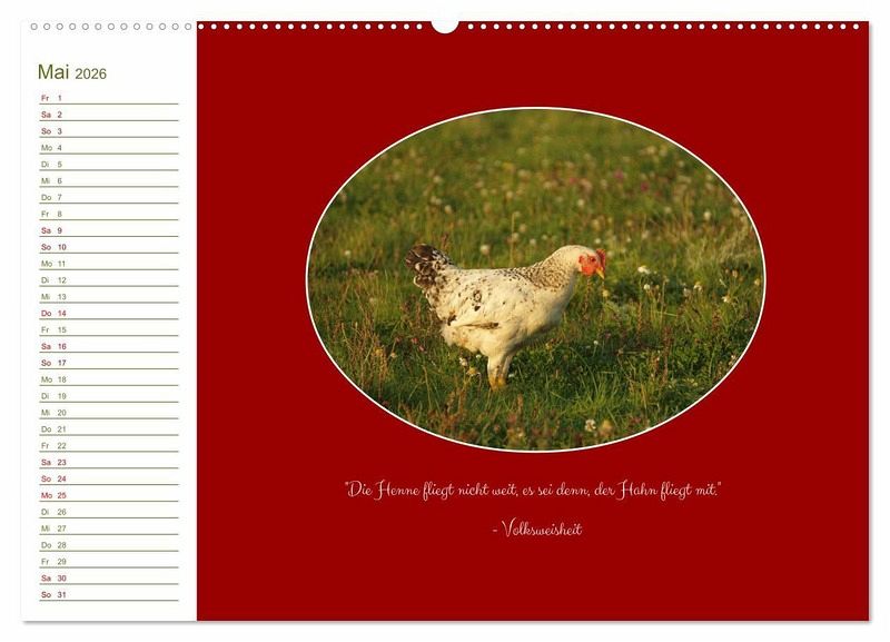 Betrachten Sie das ganze Jahr über glücklich und frei lebende Hühner in bunten Farben auf grünen Wiesen und Wegen norddeutscher Landschaft. Ergänzt werden die harmonischen Aufnahmen von augenzwinkernden, wie auch nachdenklichen Zitaten rund um das Thema Huhn.
