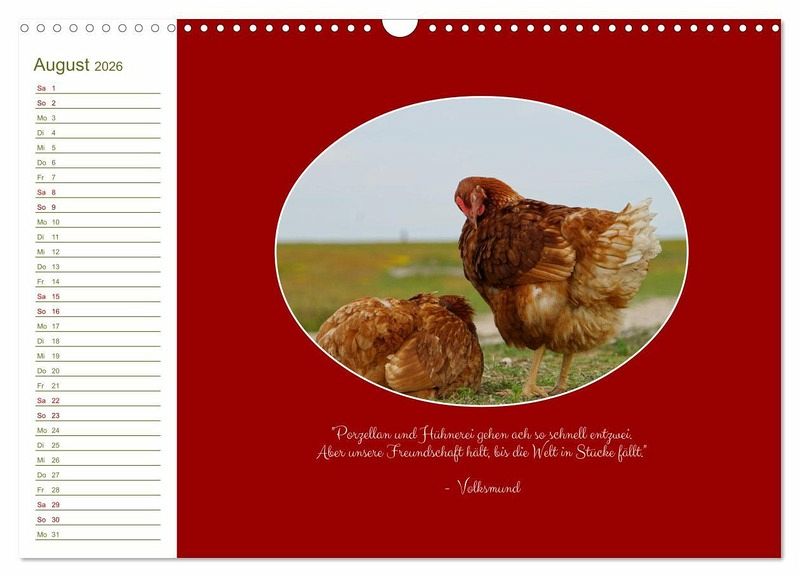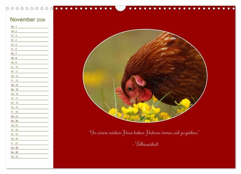 Betrachten Sie das ganze Jahr über glücklich und frei lebende Hühner in bunten Farben auf grünen Wiesen und Wegen norddeutscher Landschaft. Ergänzt werden die harmonischen Aufnahmen von augenzwinkernden, wie auch nachdenklichen Zitaten rund um das Thema Huhn.