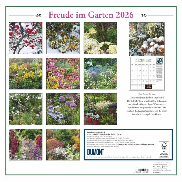 DUMONTS Broschürenkalender im praktischen 30 x 60 cm Format (geöffnet) bietet wunderschöne Aufnahmen reizvoller Gartenanlagen und Pflanzenarrangements. Die zauberhaften Fotografien aus heimischen Gärten regen zur Nachahmung an und werden begleitet von allerlei Wissenswertem über Gartenpflanzen und deren Pflege in Form von sachkundigen und zugleich sehr poetischen Texten rund um den Kreislauf der Natur und das Leben in und mit einem geliebten Garten. Das ist eine Freude für jeden Gartenfan!