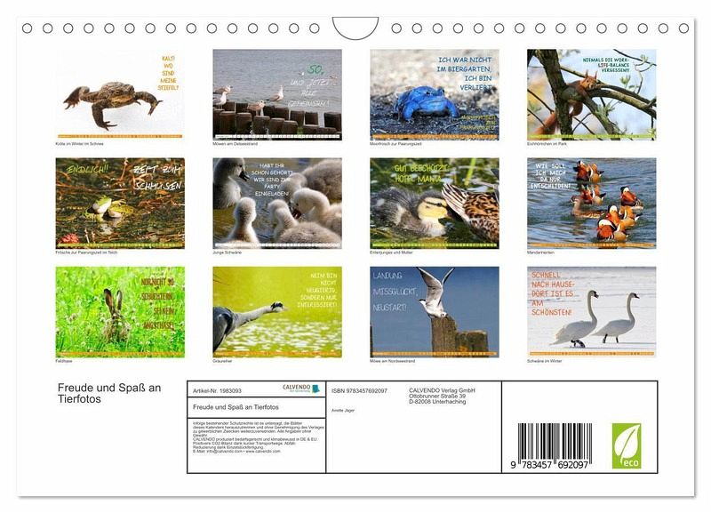 QUALITÄT - Hochwertiger Fotokalender mit 12 wunderschönen Motiven auf lichtbeständigem Bilderdruckpapier, robuste Spiralbindung mit Aufhängebügel.NACHHALTIG - deutliche Abfallreduzierung durch bedarfsgerechte Einzelstückfertigung, umweltfreundliches FSC-zertifiziertes Papier, Produktion in Deutschland, klimabewusste Logistik.PERFEKTES GESCHENK - Kalender für Freunde und Familie, für Kinder und Erwachsene, jung und alt, zu Weihnachten, Geburtstag oder zwischendurch.VIELFALT - Bildkalender in verschiedenen Formaten, z.B. DIN A5, DIN A4, DIN A3 sowie DIN A2. Ob Naturmotiv, Gemälde oder Fotos, ideal für ein persönliches Wohlfühlambiente.Humorvolle Fotografien von Tieren von Autor(in): Anette Jäger