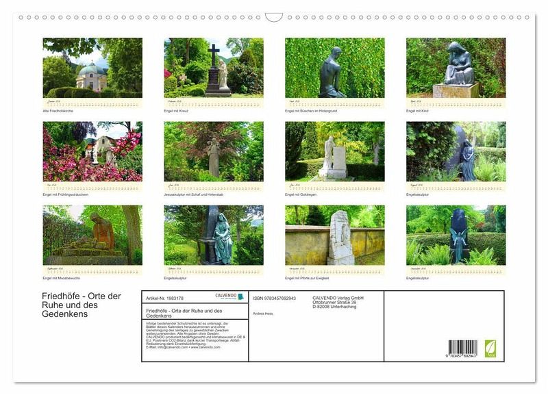 QUALITÄT - Hochwertiger Fotokalender mit 12 wunderschönen Motiven auf lichtbeständigem Bilderdruckpapier, robuste Spiralbindung mit Aufhängebügel.NACHHALTIG - deutliche Abfallreduzierung durch bedarfsgerechte Einzelstückfertigung, umweltfreundliches FSC-zertifiziertes Papier, Produktion in Deutschland, klimabewusste Logistik.PERFEKTES GESCHENK - Kalender für Freunde und Familie, für Kinder und Erwachsene, jung und alt, zu Weihnachten, Geburtstag oder zwischendurch.VIELFALT - Bildkalender in verschiedenen Formaten, z.B. DIN A5, DIN A4, DIN A3 sowie DIN A2. Ob Naturmotiv, Gemälde oder Fotos, ideal für ein persönliches Wohlfühlambiente.Friedhöfe sind nicht nur ein Ort um zu Trauern, sondern auch Orte um Ruhe und Frieden zu finden. von Autor(in): Andrea Hess
