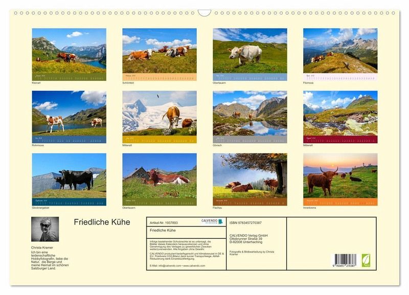 QUALITÄT - Hochwertiger Fotokalender mit 12 wunderschönen Motiven auf lichtbeständigem Bilderdruckpapier, robuste Spiralbindung mit Aufhängebügel.NACHHALTIG - deutliche Abfallreduzierung durch bedarfsgerechte Einzelstückfertigung, umweltfreundliches FSC-zertifiziertes Papier, Produktion in Deutschland, klimabewusste Logistik.PERFEKTES GESCHENK - Kalender für Freunde und Familie, für Kinder und Erwachsene, jung und alt, zu Weihnachten, Geburtstag oder zwischendurch.VIELFALT - Bildkalender in verschiedenen Formaten, z.B. DIN A5, DIN A4, DIN A3 sowie DIN A2. Ob Naturmotiv, Gemälde oder Fotos, ideal für ein persönliches Wohlfühlambiente.Bilder von friedlichen Kühen auf der Alm von Autor(in): Christa Kramer