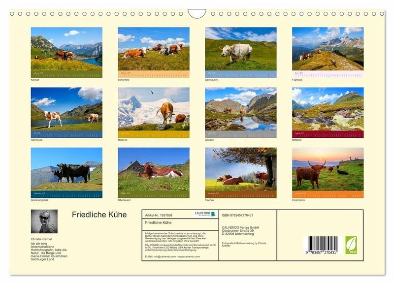QUALITÄT - Hochwertiger Fotokalender mit 12 wunderschönen Motiven auf lichtbeständigem Bilderdruckpapier, robuste Spiralbindung mit Aufhängebügel.NACHHALTIG - deutliche Abfallreduzierung durch bedarfsgerechte Einzelstückfertigung, umweltfreundliches FSC-zertifiziertes Papier, Produktion in Deutschland, klimabewusste Logistik.PERFEKTES GESCHENK - Kalender für Freunde und Familie, für Kinder und Erwachsene, jung und alt, zu Weihnachten, Geburtstag oder zwischendurch.VIELFALT - Bildkalender in verschiedenen Formaten, z.B. DIN A5, DIN A4, DIN A3 sowie DIN A2. Ob Naturmotiv, Gemälde oder Fotos, ideal für ein persönliches Wohlfühlambiente.Bilder von friedlichen Kühen auf der Alm von Autor(in): Christa Kramer