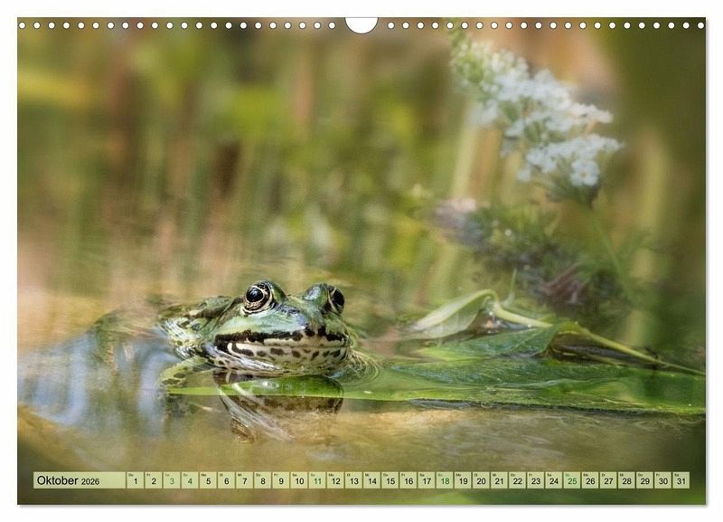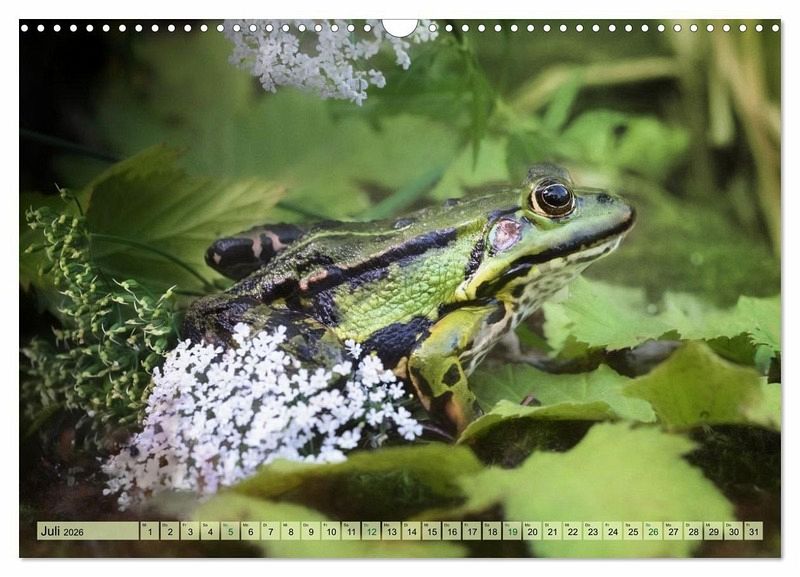 Erlebenn Sie Frösche aus einer einzigartigen Perspektive in diesem besonderen Kalender. Mit zwölf Motiven, die die kleinen Amphibien in ihrer natürlichen Umgebung zeigen - sei es zwischen Blüten, m Gras oder im Wasser. Die Aufnahmen fangen Frösche in inem seltenen,direkten Blickkontakt ein, sodass Sie die Lebendigkeit und Charme dieser faszinierenden Tiere hautnah erleben können. Ein Muss für Naturfreunde und Froschliebhaber!