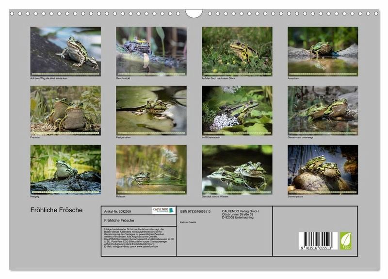 QUALITÄT - Hochwertiger Fotokalender mit 12 wunderschönen Motiven auf lichtbeständigem Bilderdruckpapier, robuste Spiralbindung mit Aufhängebügel.NACHHALTIG - deutliche Abfallreduzierung durch bedarfsgerechte Einzelstückfertigung, umweltfreundliches FSC-zertifiziertes Papier, Produktion in Deutschland, klimabewusste Logistik.PERFEKTES GESCHENK - Kalender für Freunde und Familie, für Kinder und Erwachsene, jung und alt, zu Weihnachten, Geburtstag oder zwischendurch.VIELFALT - Bildkalender in verschiedenen Formaten, z.B. DIN A5, DIN A4, DIN A3 sowie DIN A2. Ob Naturmotiv, Gemälde oder Fotos, ideal für ein persönliches Wohlfühlambiente.Zwölf bezaubernde Froschmotive, die Frösche in ihrem natürlichen Lebensraum zeigen. Ein Kalender für Froschliebhaber und Naturfreunde. von Autor(in): Kathrin Gawlik