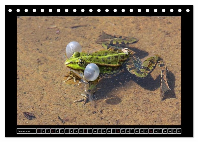 Frösche und Kröten gehören zu den Froschlurchen und sind Amphibien und begeistern Naturfreunde durch ihren Artenreichtum und Farbenpracht. Sei es nun der kleine Färberfrosch oder der große Laubfrosch - jeder hat seine Besonderheit. Ein paar Froschlurche wurden für diesen Kalender auf Fotos gebannt .