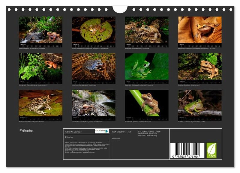 QUALITÄT - Hochwertiger Fotokalender mit 12 wunderschönen Motiven auf lichtbeständigem Bilderdruckpapier, robuste Spiralbindung mit Aufhängebügel.NACHHALTIG - deutliche Abfallreduzierung durch bedarfsgerechte Einzelstückfertigung, umweltfreundliches FSC-zertifiziertes Papier, Produktion in Deutschland, klimabewusste Logistik.PERFEKTES GESCHENK - Kalender für Freunde und Familie, für Kinder und Erwachsene, jung und alt, zu Weihnachten, Geburtstag oder zwischendurch.VIELFALT - Bildkalender in verschiedenen Formaten, z.B. DIN A5, DIN A4, DIN A3 sowie DIN A2. Ob Naturmotiv, Gemälde oder Fotos, ideal für ein persönliches Wohlfühlambiente.Froschlurche aus aller Welt von Autor(in): Benny Trapp
