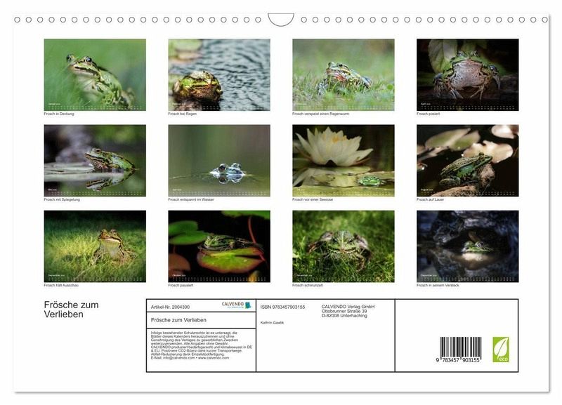 QUALITÄT - Hochwertiger Fotokalender mit 12 wunderschönen Motiven auf lichtbeständigem Bilderdruckpapier, robuste Spiralbindung mit Aufhängebügel.NACHHALTIG - deutliche Abfallreduzierung durch bedarfsgerechte Einzelstückfertigung, umweltfreundliches FSC-zertifiziertes Papier, Produktion in Deutschland, klimabewusste Logistik.PERFEKTES GESCHENK - Kalender für Freunde und Familie, für Kinder und Erwachsene, jung und alt, zu Weihnachten, Geburtstag oder zwischendurch.VIELFALT - Bildkalender in verschiedenen Formaten, z.B. DIN A5, DIN A4, DIN A3 sowie DIN A2. Ob Naturmotiv, Gemälde oder Fotos, ideal für ein persönliches Wohlfühlambiente.Frösche zu Land und zu Wasser von Autor(in): Kathrin Gawlik