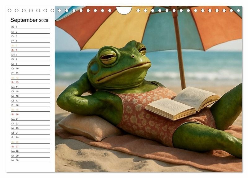 Der "Strandfrosch" bringt Urlaubsstimmung an die Wand: Ein grüner Frosch, mal entspannt in der Sonne, mal spielerisch am Meer - stets cineastisch und fotorealistisch inszeniert. Die Motive entstanden mit modernster KI Bildtechnik und verbinden detailreiche Strandatmosphäre mit einem tierischen Augenzwinkern. Jeder Monat zeigt einen Frosch in einer neuen Szene voller Humor, Leichtigkeit und Sommerfeeling. Ein besonderer Begleiter für alle, die sich das Meer nach Hause holen möchten und dabei Lust auf etwas Außergewöhnliches haben.