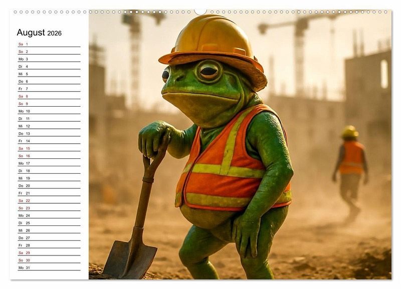 Der "Arbeitsfrosch" nimmt den Alltag im Job mit stoischer Gelassenheit. Ob hinter der Supermarktkasse, im Bauarbeiter-Outfit oder als Taxifahrer in der Nacht - dieser grüne Frosch mit Strohhut erledigt seine Aufgaben auf seine ganz eigene Art: ruhig, humorvoll und immer mit einem Augenzwinkern. Die detailreichen, AI KI generierten, fotorealistischen Frosch Motive zeigen den tierischen Helden in abwechslungsreichen Berufen, mit vielen liebevollen Details im Vorder- und Hintergrund. Ein origineller Jahresbegleiter für alle, die Büro- und Arbeitsalltag mit Humor nehmen - oder schon längst auf…mehr