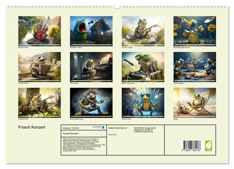 PREMIUM-LINIE - Brillanter Fotokalender mit 12 wunderschönen Motiven, Kunstdruck in Hochglanz in Museumsqualität.QUALITÄT - edle Materialien, stabile Rückwand mit 2 innovativen Einstecktaschen für eine optimale Präsentation an der Wand.NACHHALTIG - deutliche Abfallreduzierung durch bedarfsgerechte Einzelstückfertigung, umweltfreundliches FSC-zertifiziertes Papier, Produktion in Deutschland, klimabewusste Logistik.PERFEKTES GESCHENK - Kalender für Freunde und Familie, für Kinder und Erwachsene, jung und alt, zu Weihnachten, Geburtstag oder zwischendurch.Froschmusik für das ganze Jahr von Autor(in): Daniel Rohr