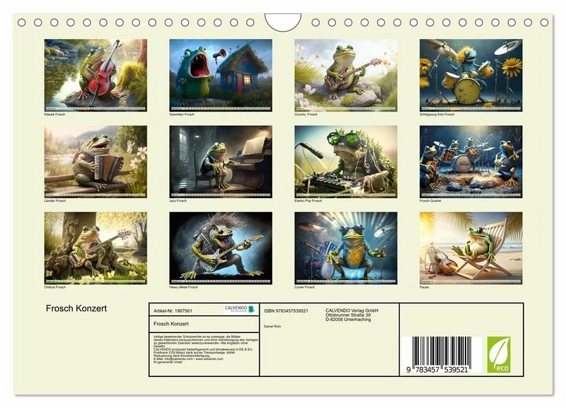QUALITÄT - Hochwertiger Fotokalender mit 12 wunderschönen Motiven auf lichtbeständigem Bilderdruckpapier, robuste Spiralbindung mit Aufhängebügel.NACHHALTIG - deutliche Abfallreduzierung durch bedarfsgerechte Einzelstückfertigung, umweltfreundliches FSC-zertifiziertes Papier, Produktion in Deutschland, klimabewusste Logistik.PERFEKTES GESCHENK - Kalender für Freunde und Familie, für Kinder und Erwachsene, jung und alt, zu Weihnachten, Geburtstag oder zwischendurch.VIELFALT - Bildkalender in verschiedenen Formaten, z.B. DIN A5, DIN A4, DIN A3 sowie DIN A2. Ob Naturmotiv, Gemälde oder Fotos, ideal für ein persönliches Wohlfühlambiente.Froschmusik für das ganze Jahr von Autor(in): Daniel Rohr