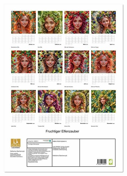 Willkommen in der zauberhaften Welt des fruchtigen KI-Elfenzaubers. Dieser einzigartiger Kalender entführt Sie Monat für Monat in ein KI-Märchenland, wo süße Elfen mit fantasievollem, fruchtigem Kopfschmuck Ihre Sinne verzaubern. Jede Seite offenbart eine neue KI-Elfe, geschmückt mit prachtvollen Obstschmuck, die Ihre Vorstellungskraft beflügeln und Ihrem Alltag einen Hauch von Magie verleihen. Perfekt für Träumer und Naturliebhaber gleichermaßen, bringt dieser Kalender Farbe und Freude in Ihr Zuhause oder Büro. Erleben Sie den Charme und die Anmut dieser fruchtigen Elfen und lassen Sie sich das ganze Jahr über von ihrer zauberhaften Ausstrahlung inspirieren. Dieser qualitativ hochwertige Kalender gehört zur exklusiven CALVENDO Gold-Edition.