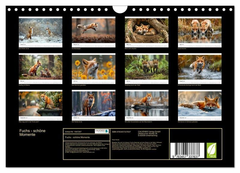 Begeben Sie sich mit diesem Fuchs-Kalender auf eine Reise in die Natur. Erfreuen Sie sich an den bezaubernden Szenen von Füchsen, die sich frei in ihrem natürlichen Lebensraum bewegen. Bewundern Sie diese scheuen Tiere und ihren Nachwuchs auf ihren abenteuerlichen Streifzügen in Feld, Wald und Flur. Der Fotokünstler Peter Roder hat fantastische KI-Bilder gestaltet und zusammengestellt. Zwölf wunderschöne Bilder, die Sie begeistern werden.