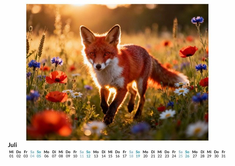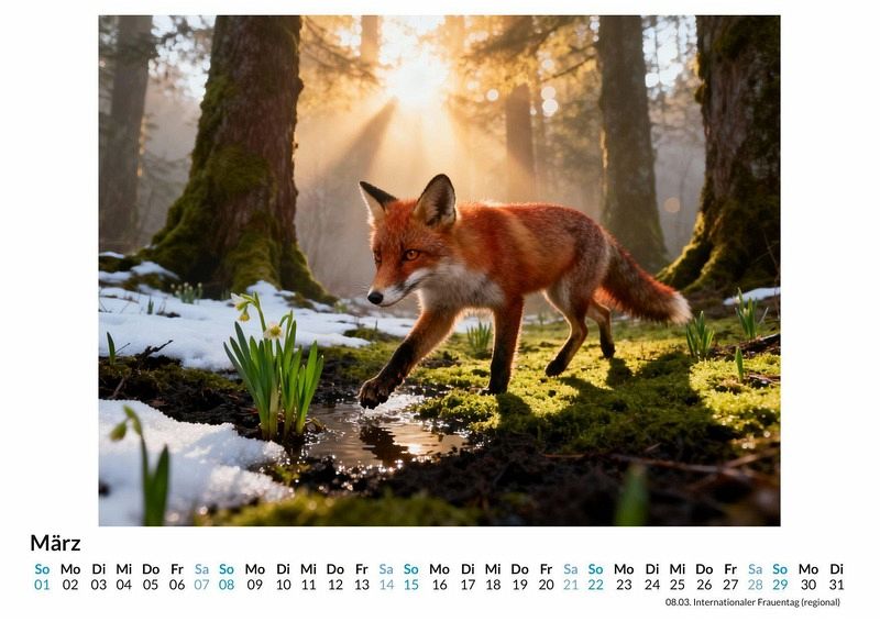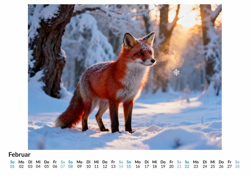 Ein roter Schimmer im weißen Schnee, ein wachsamer Blick aus dem dichten Unterholz - der Fuchs fasziniert seit jeher durch seine geheimnisvolle und intelligente Präsenz. Er bewegt sich lautlos durch urwüchsige Wälder und weite, verschneite Ebenen, ein lebendiges Symbol für Anpassungsfähigkeit und scharfen Instinkt. Der Kalender "Fuchs" fängt diese besondere Stimmung ein und begleitet durch das Jahr mit Motiven, die von der schlauen und mystischen Ausstrahlung dieses einzigartigen Wildtieres erzählen. Dieser Kalender ist eine gute Wahl für: Liebhaber von Wildtieren und unberührter Natur. Menschen, die die stille Schönheit des Waldes und des Winters schätzen. Alle, die sich von der Symbolik und dem Charakter des Fuchses angezogen fühlen. Jedes Monatsblatt präsentiert den Fuchs in einer anderen Facette seiner natürlichen Umgebung. Mal blickt er neugierig aus einem frostigen Gebüsch bei Sonnenaufgang, mal durchstreift er eine nebelverhangene Lichtung im Dämmerlicht. Die Motive sind keine Fotografien im klassischen Sinn. Vielmehr wurden diese Szenen durch das Zusammenspiel von kreativen Impulsen und komplexen Rechenoperationen zum Leben erweckt, um die mystische Aura des Tieres in den Landschaften zu verdichten und eine ganz eigene Bildsprache zu schaffen. Mit dem Kauf dieses Kalenders erhält man: Zwölf Monatsmotive, die den Fuchs in Wald und Winter zeigen. Ein praktisches Kalendarium für die Organisation von Terminen. Eine atmosphärische Wanddekoration für das ganze Jahr. Der Kalender ist eine Hommage an die stille Eleganz und die sagenumwobene Klugheit des Fuchses. Er bietet jeden Monat einen neuen Einblick in seine verborgene Welt. Eine Einladung, die zwölf Darstellungen zu betrachten und sich von der besonderen Atmosphäre durch das Jahr begleiten zu lassen.