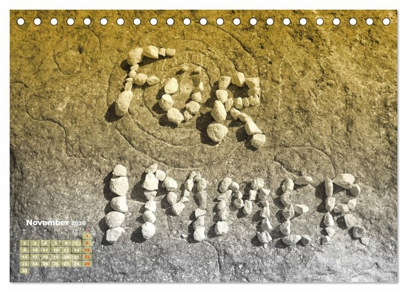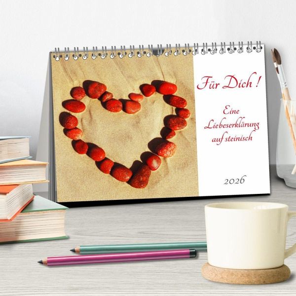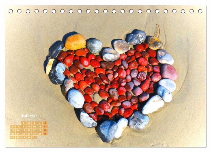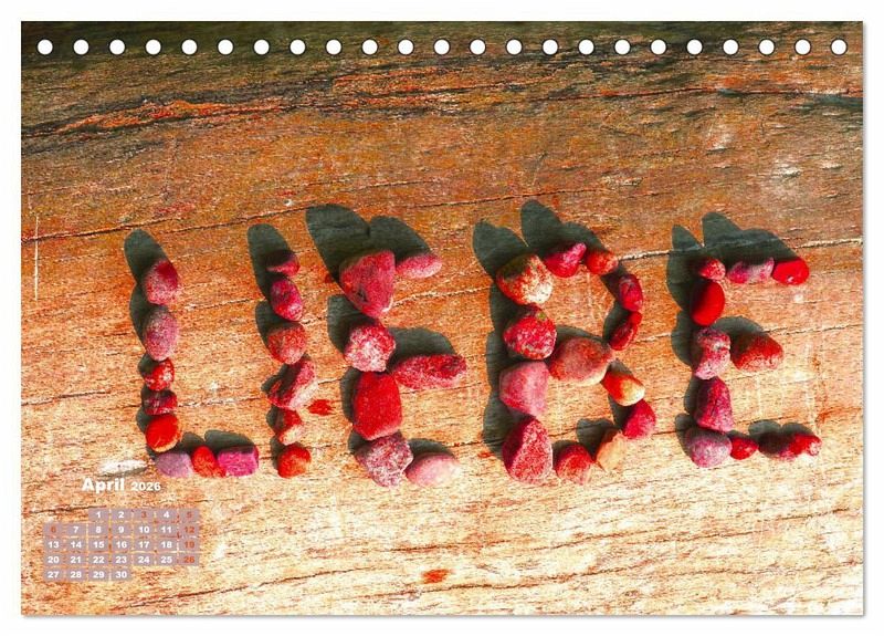 Sie haben das Bedürfnis, ihrem Partner oder ihrer Partnerin eine ganz besondere, individuelle und romantische Liebeserklärung zu schenken? Dann sind Sie mit diesem Kalender richtig. 12 Bilder mit verschiedenen Herzmotiven (Herzformen und Liebeswörter aus Steinen gelegt, Herzen in Steine und Steine in Herzform) sorgen für ein wundervolles, ganz persönliches und unvergessliches