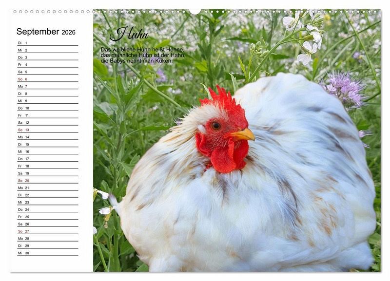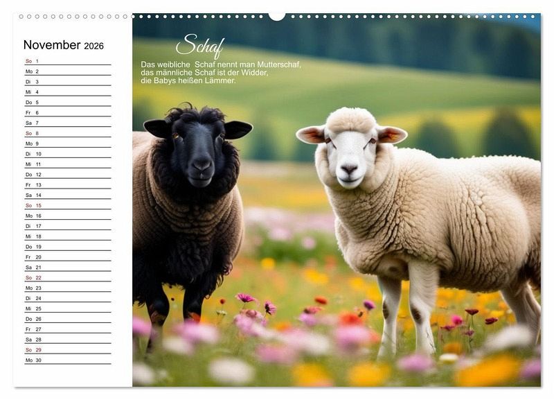 Mit Hilfe der KI wurden die wichtigsten Haus- und Hoftiere in Szene gesetzt. Die Kinder erfahren darüber hinaus wie die weiblichen, männlichen Tiere und deren Babys genannt werden. Durch die praktische Planerfunktion auf weißem Untergrund ist das Eintragen von Termine für die Kids möglich.