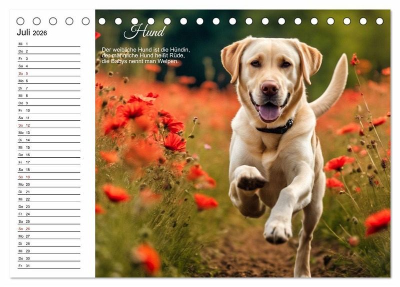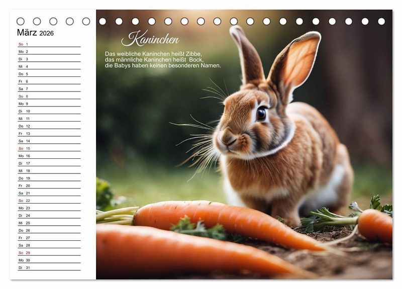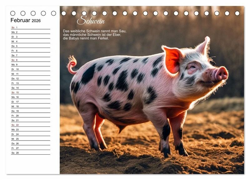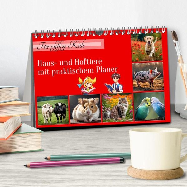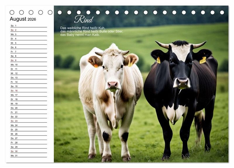 Mit Hilfe der KI wurden die wichtigsten Haus- und Hoftiere in Szene gesetzt. Die Kinder erfahren darüber hinaus wie die weiblichen, männlichen Tiere und deren Babys genannt werden. Durch die praktische Planerfunktion auf weißem Untergrund ist das Eintragen von Termine für die Kids möglich.
