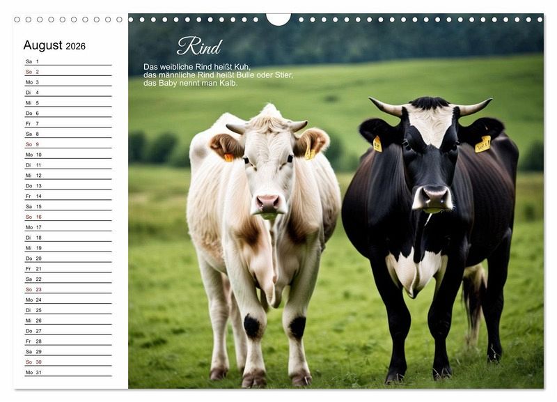 Mit Hilfe der KI wurden die wichtigsten Haus- und Hoftiere in Szene gesetzt. Die Kinder erfahren darüber hinaus wie die weiblichen, männlichen Tiere und deren Babys genannt werden. Durch die praktische Planerfunktion auf weißem Untergrund ist das Eintragen von Termine für die Kids möglich.