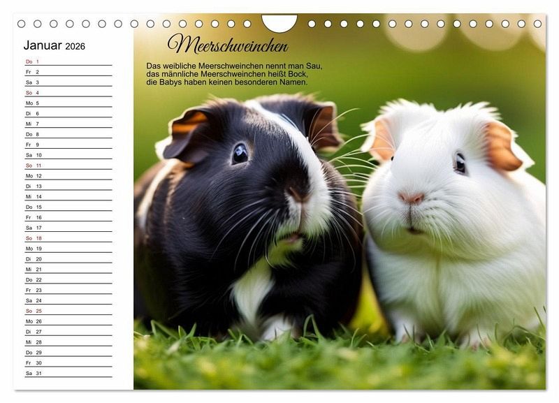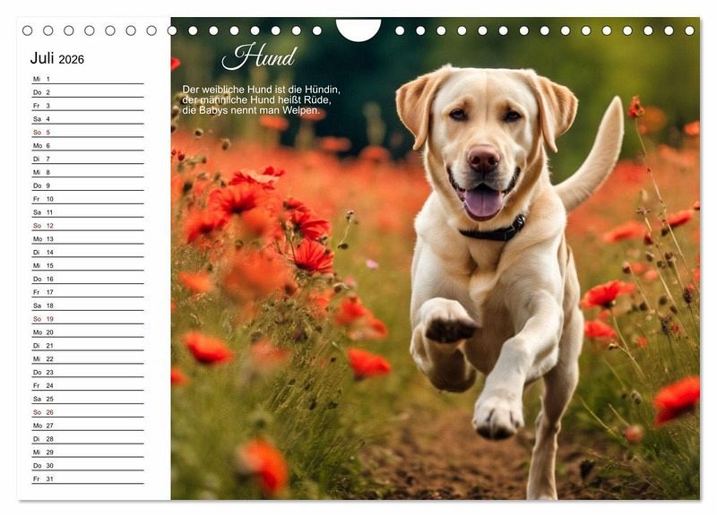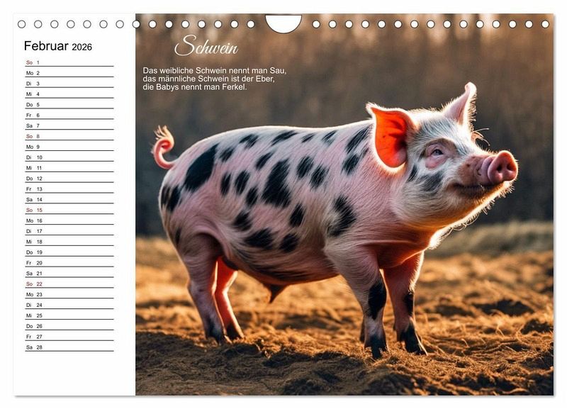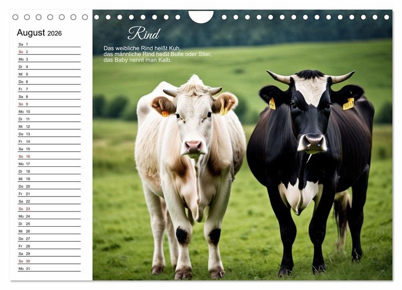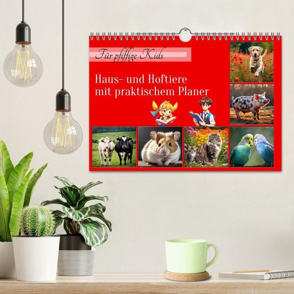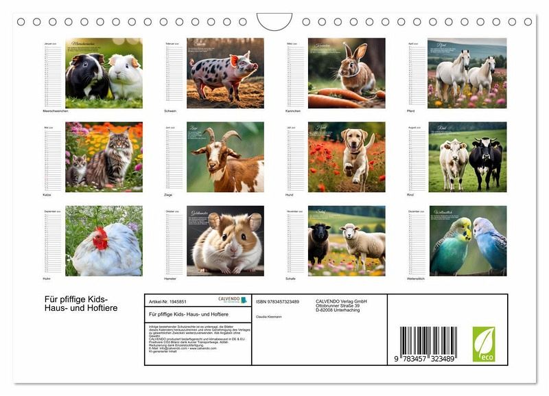 Mit Hilfe der KI wurden die wichtigsten Haus- und Hoftiere in Szene gesetzt. Die Kinder erfahren darüber hinaus wie die weiblichen, männlichen Tiere und deren Babys genannt werden. Durch die praktische Planerfunktion auf weißem Untergrund ist das Eintragen von Termine für die Kids möglich.