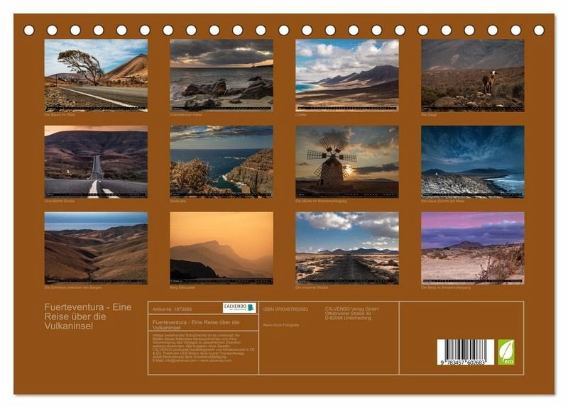 Mit diesem Kalender nehme ich Sie auf eine Reise über die faszinierende Insel Fuerteventura mit. Von den berühmten Windmühlen über felsige Landschaften, bis zu atemberaubenden Sonnenuntergängen ist alles dabei. Diese Motivauswahl ist einzigartig und machen diesen Kalender zu einem Unikat. Holen Sie sich den Urlaub für 12 Monate in Ihr Zuhause oder Büro.
