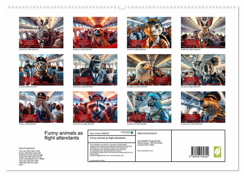 PREMIUM COLLECTION - Brilliant photo calendar with 12 beautiful motifs, high-gloss art print in museum quality.QUALITY - high-quality materials, sturdy back cover with 2 innovative insert pockets for optimum presentation on the wall.SUSTAINABLE - significant reduction in waste thanks to customised one-off production, environmentally friendly FSC-certified paper, production in Germany, climate-conscious logistics.PERFECT GIFT - calendars for friends and family, for children and adults, young and old, for Christmas, birthdays or in between.Funny animals in stewardess uniform and cool phrases for all flight attendants von Autor(in): Peter Rübsamen