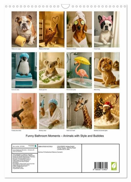 QUALITY - High-quality photo calendar with 12 beautiful images on light-resistant paper, robust spiral binding with hanger.SUSTAINABLE - Significant waste reduction due to print-on-demand production, environmentally friendly FSC-certified paper, produced in the UK, climate-conscious logistical processes.PERFECT GIFT - calendars for friends and family, for children, all ages and all occasions, from Christmas to birthdays and everything in between.LOTS OF CHOICE - Wall calendars in different sizes (DIN A4 and DIN A3), for any topic and personal taste, featuring photography, painting and illustrations.Adorable animals enjoying their spa time with humor, charm, and a touch of luxury., author: Marena Camadini