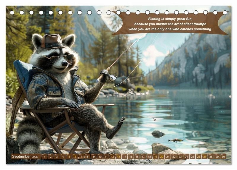 Dive into a year of laughter and charm with our exclusive 'Funny Charming Animals as Fishermen' annual calendar. Each month, you're greeted by a delightful animal, donned in the cutest angler outfit, ready to tackle the lake's adventures. These AI generated images are paired with witty slogans that capture the heart of fishing fun. Perfect for anglers, fishermen, or anyone who loves a good chuckle, this calendar is not just a way to track the days, it's a monthly dose of joy and humour. Gift it to your fishing buddies or keep it for yourself to enjoy a year filled with fishing follies and furry friends. Get hooked on the smiles and surprises each page. Ideal for hanging in your home, office, or cabin, it's a catch you won't want to release. Order now and reel in the delight of fishing.