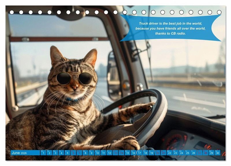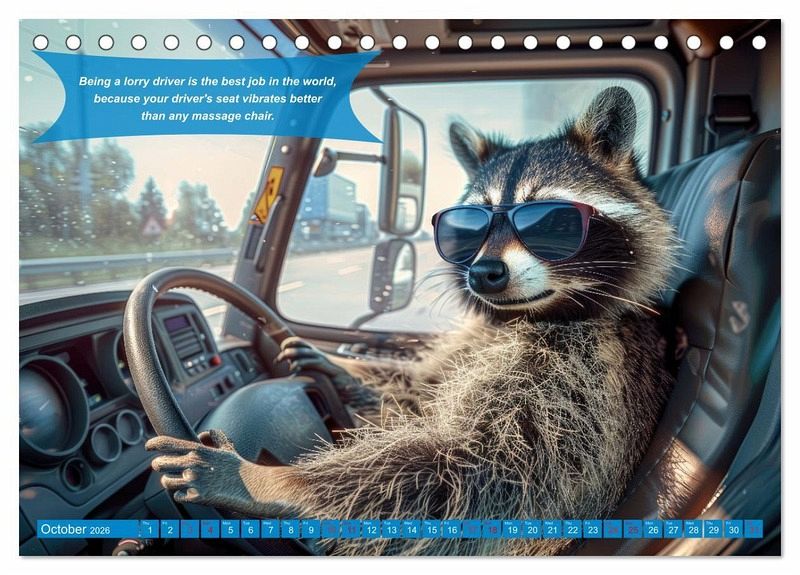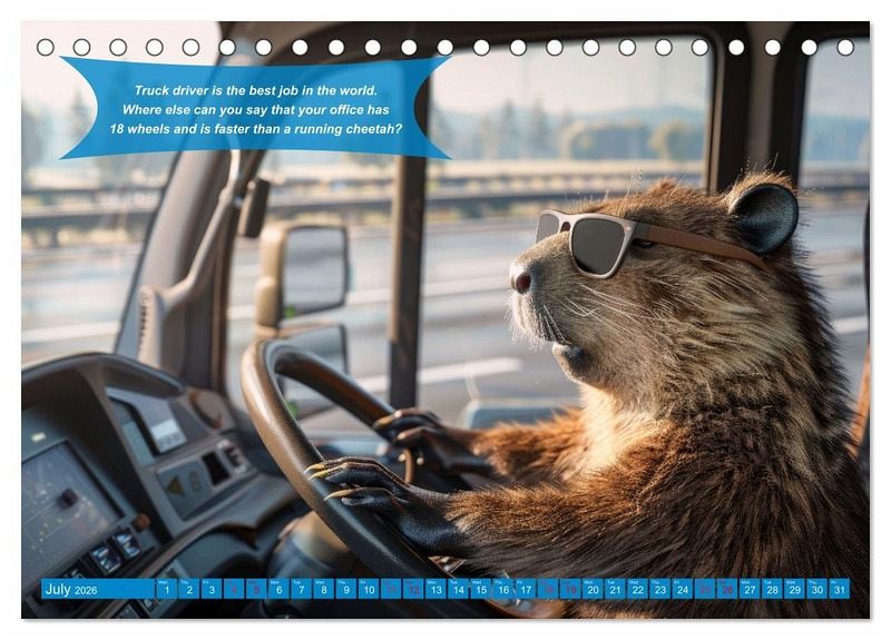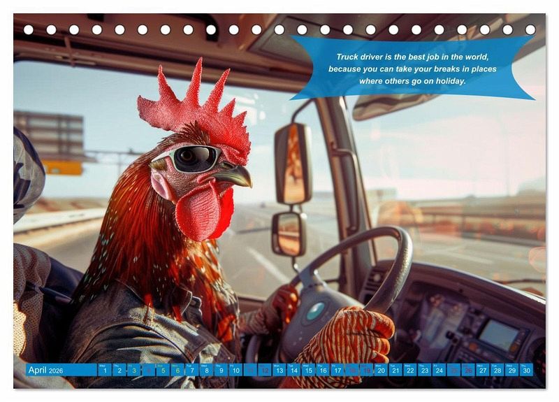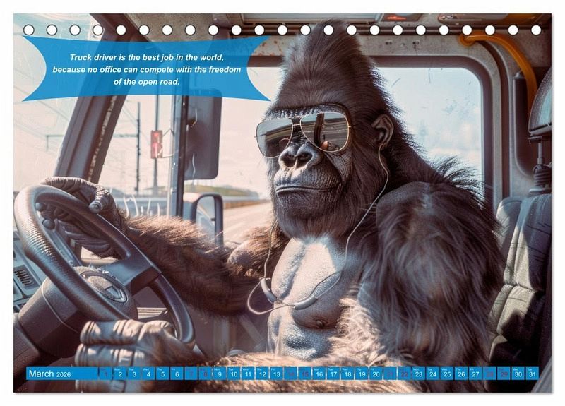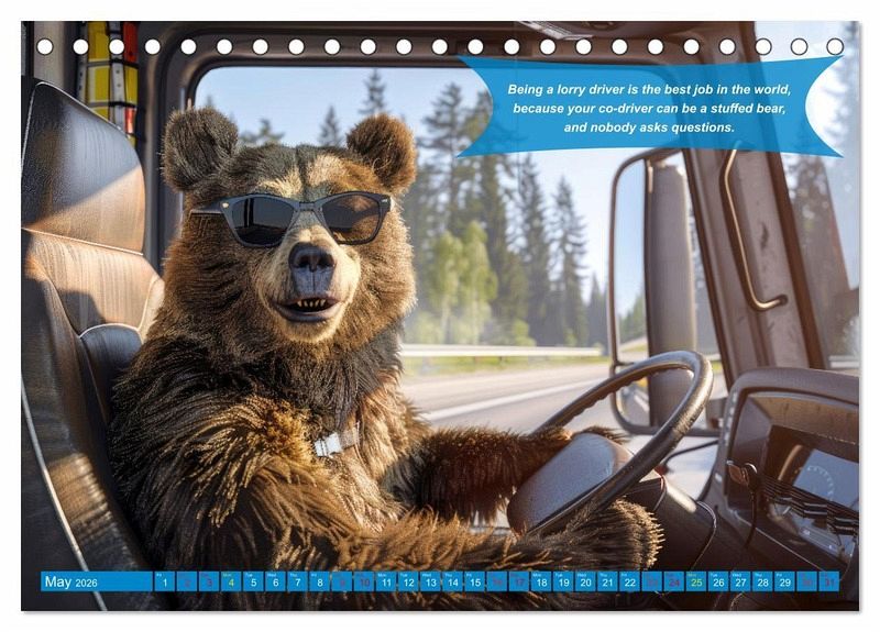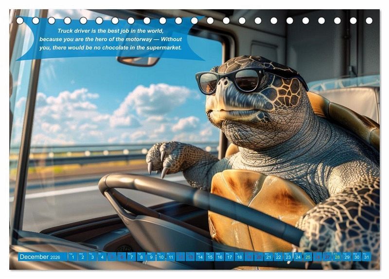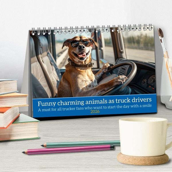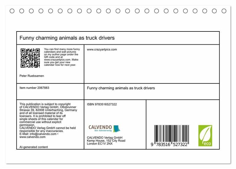 Discover the ultimate annual calendar for all truck and lorry drivers and truckers with a sense of humour 'Funny charming animals as truck drivers'. This unique calendar is the perfect blend of fun and fascination that will delight every month. With a carefully selected collection of AI-generated images featuring animals in the truck, accompanied by hilarious sayings, this calendar is more than just a date display. It's a daily mood lifter. Whether for yourself or as a gift, this calendar is the ideal choice for anyone working in the transport industry who wants to bring a smile to themselves or their colleagues. Ideal for birthdays, public holidays or as a small gift in between. With this calendar you are always on the right track.