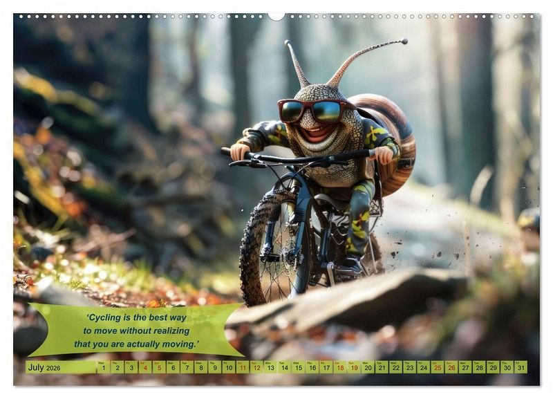 Discover the ultimate annual companion for any cycling enthusiast. 'Funny charming animals on a bicycle'. With a unique collection of humorous quotes and AI-generated adorable images of animals on bikes, this calendar is more than just a date display. It's a daily dose of joy and inspiration. Perfect for the wall in the workshop, above the desk or as a gift for the cyclist in your life who has everything. The 'Funny charming animals on a bicycle' calendar is not only an eye-catcher, but also a reminder that life on two wheels is always an adventure, accompanied by our animal friends. Because every day is a good opportunity to pedal with a smile.