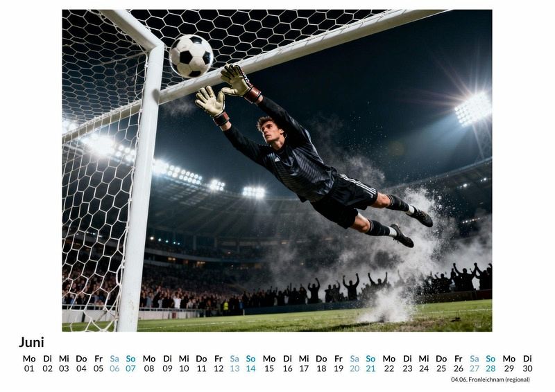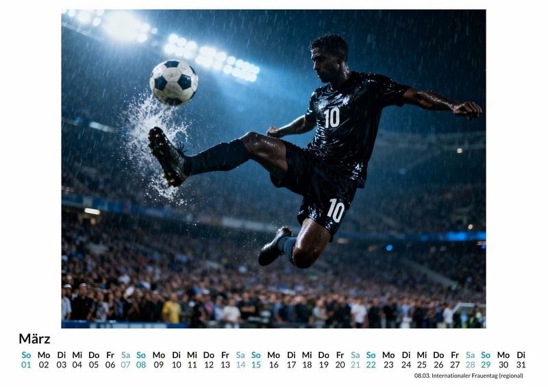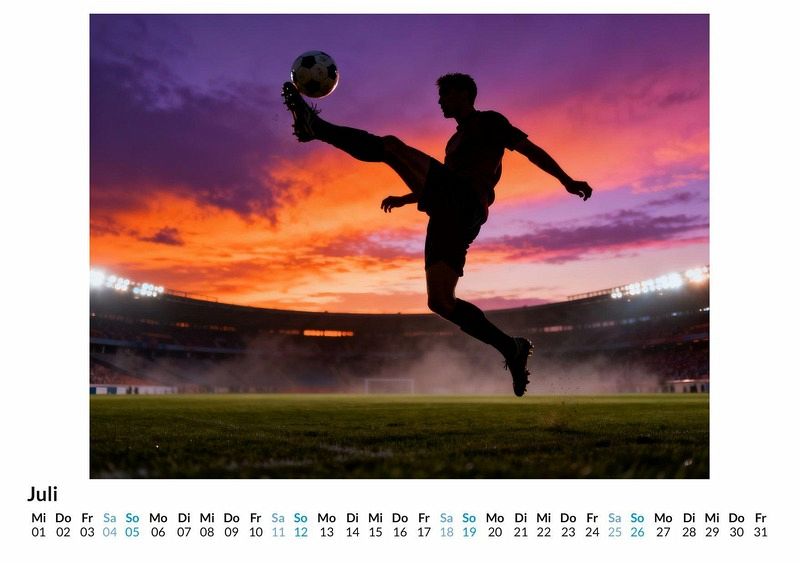 Es gibt Momente im Fußball, die sich ins kollektive Gedächtnis eingebrannt haben. Eine einzige Bewegung, eine charakteristische Pose oder ein triumphaler Jubel genügt, um eine ganze Ära wieder aufleben zu lassen und den Spieler dahinter sofort zu erkennen, selbst ohne sein Gesicht zu sehen. Dieser Kalender ist optimal für: Alle, die die großen Momente des Fußballs schätzen. Liebhaber von stilvoller, reduzierter Ästhetik. Jeden, der ein originelles Geschenk für einen Fußballfan sucht. Der Kalender "Fußball-Legenden" fängt genau diese ikonischen Posen ein. Zwölf stilisierte Darstellungen ehren die größten Spieler der Fußballgeschichte, ohne ihre Gesichter zu zeigen. Die Konzentration liegt vollständig auf der Silhouette, der Dynamik der Bewegung und dem unverkennbaren Stil, der sie zu Legenden machte. Jedes Motiv wurde durch die Interpretation unzähliger Datenpunkte von einem kreativen Rechenprozess neu geschaffen und bietet so eine frische, künstlerische Perspektive auf bekannte Szenen des Weltsports. Beim Kauf kann man Folgendes erwarten: Zwölf anonymisierte Darstellungen legendärer Fußballer. Ein praktischer Monatskalender im übersichtlichen Format. Ein dekoratives Element für jeden Raum. Der Kalender "Fußball-Legenden" ist somit eine Hommage an die unvergesslichen Augenblicke des Sports, eingefangen in einer modernen und reduzierten Form. Er zelebriert die Helden des Fußballs auf eine Weise, die bewusst Raum für die eigene Erinnerung und Interpretation lässt. Es lohnt sich, die einzelnen Monatsblätter anzuschauen und die Faszination dieser Legenden aus einem neuen Blickwinkel zu erleben.