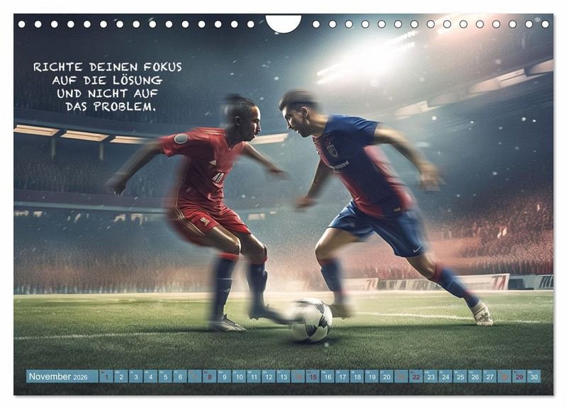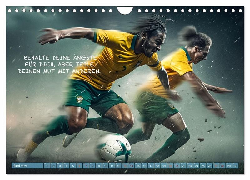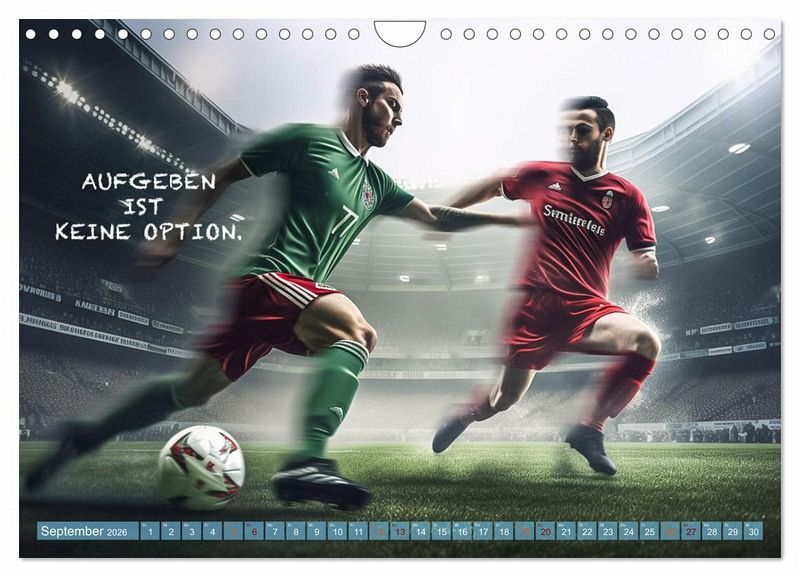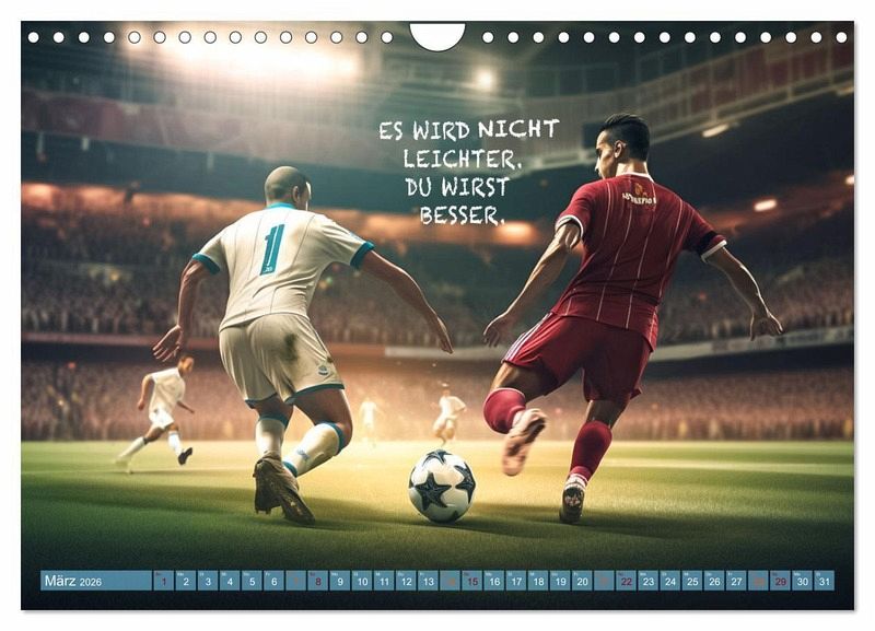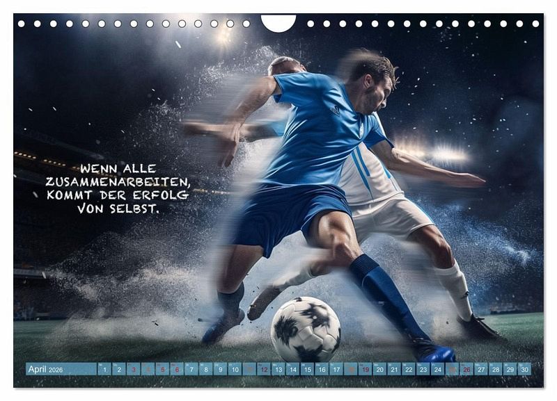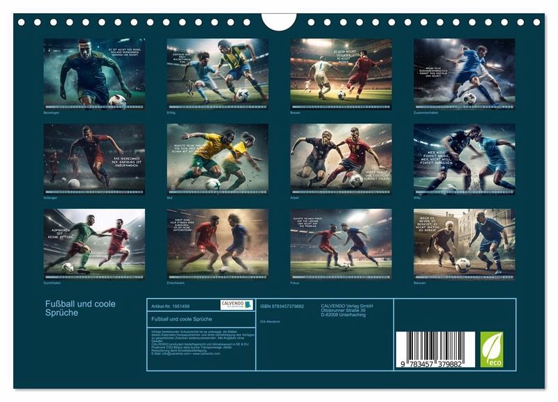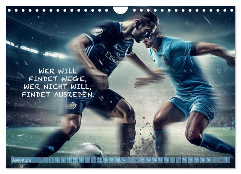 Dieser wundervolle einzigartige Fußballkalender des Fotografen Dirk Meutzner, wird Sie Monat für Monat immer wieder aufs neue begeistern und motivieren. Er wird Sie anspornen zu Höchstleistungen und in schwierigen Zeiten wieder aufrichten. Da unsere Zeit, geprägt von Ängsten und Burnout ist, ist es wichtig sich immer wieder selbst zu motivieren und die Gedanken positiv zu beeinflussen. Dieser Kalender eignet sich auch als Geschenk für die Menschen, die Ihnen etwas bedeuten und die Sie lieben. Realisiert und bearbeitet wurde dieser Kalender mit KI und Photoshop.