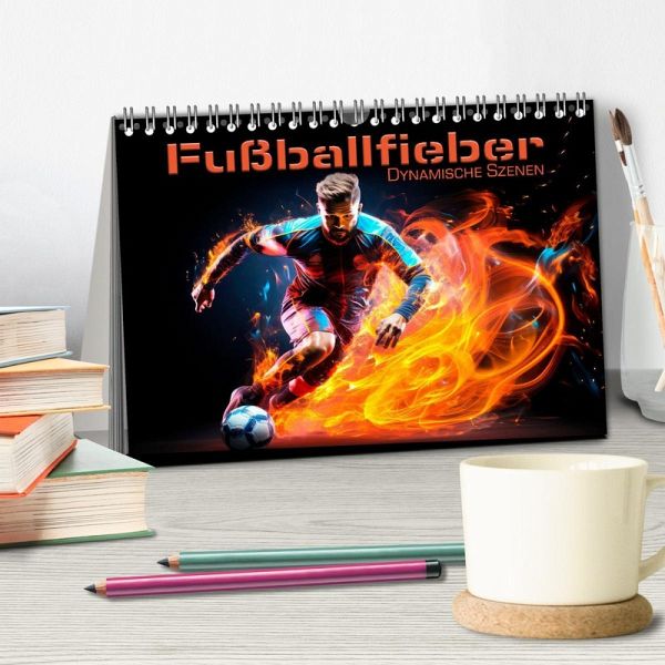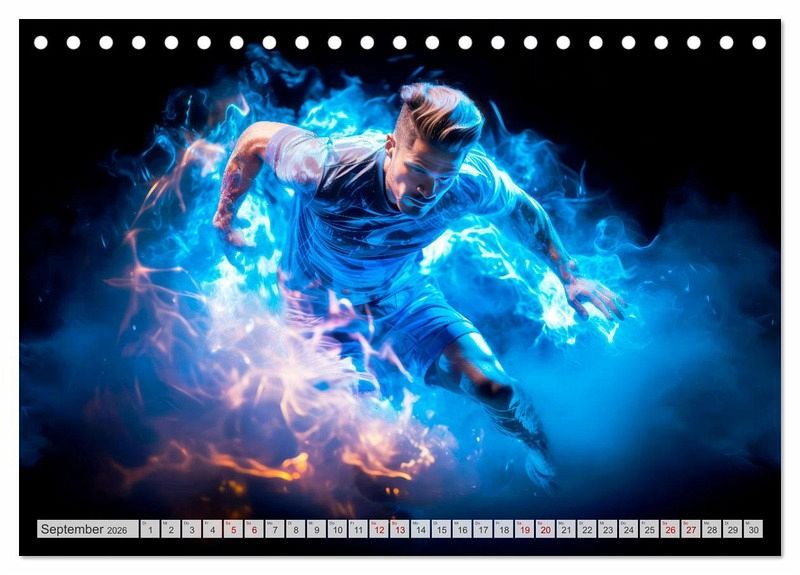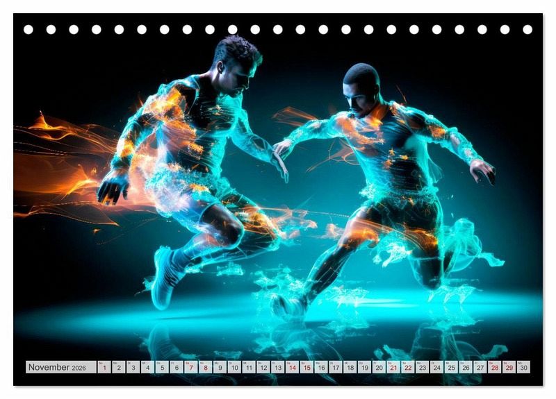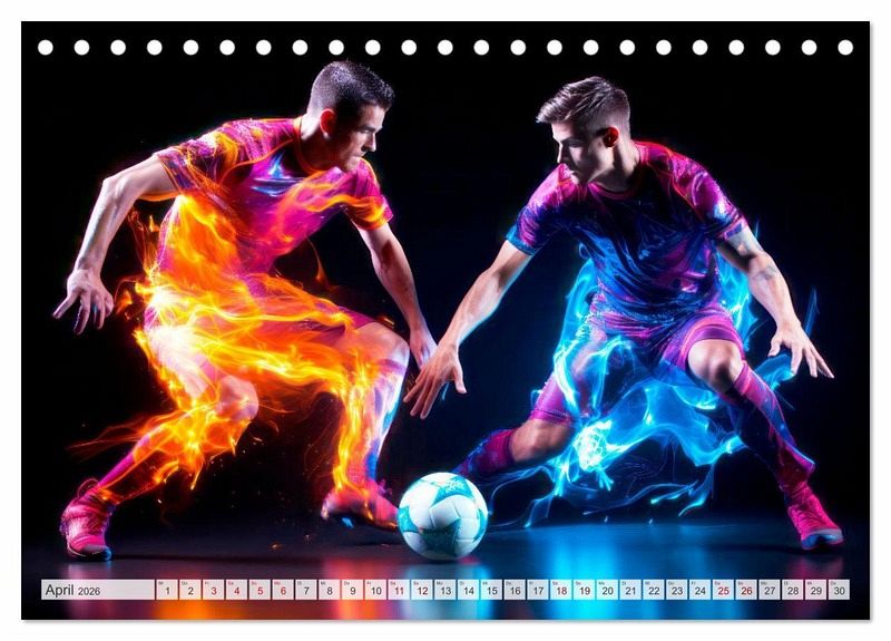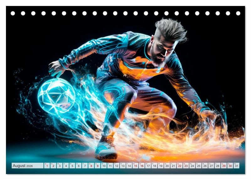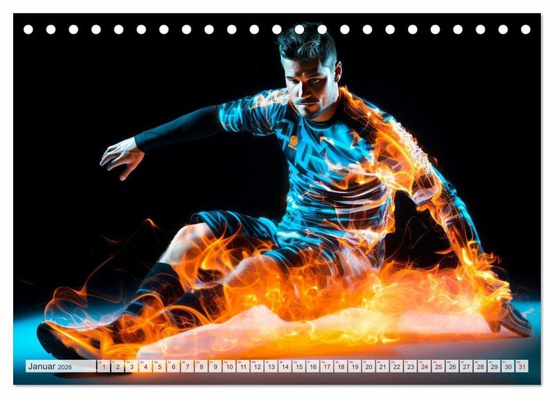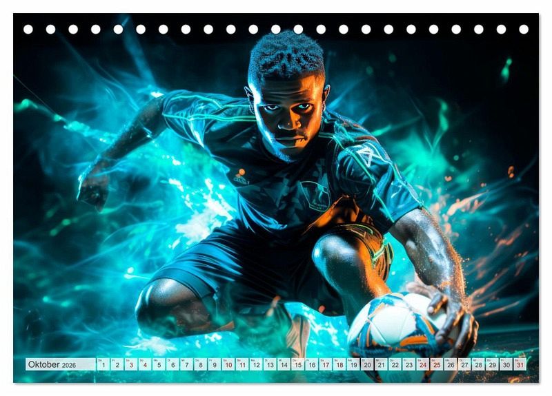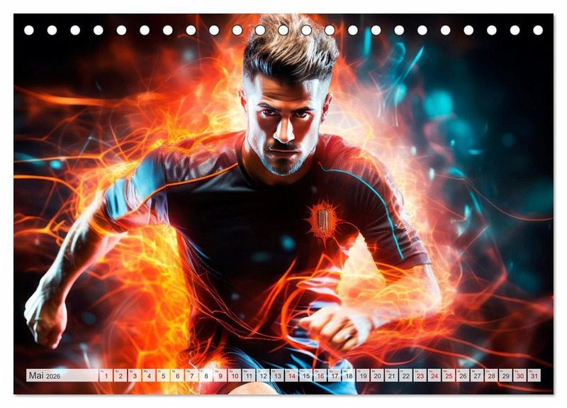 Erlebt athletische Fußballspieler in actiongeladenen Momentaufnahmen und spürt die gewaltige Kraft der Zweikämpfe, Schüsse, Sprints und anderen taktischen Manöver. Lass Dich von 12 ultramodern inszenierten Motiven das Jahr begleiten. Die fantastischen Szenen wurden in Zusammenarbeit mit künstlicher Intelligenz erschaffen.