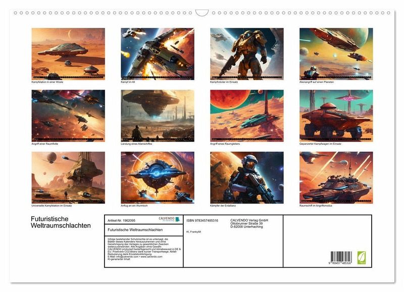 Tauchen Sie ein in die faszinierende Welt der Weltraumschlachten mit unserem Wandkalender! Mit aufregenden futuristischen, von KI erstellten, Bildern von Schlachten im All und auf anderen Planeten ist dieser Kalender ein absolutes Must-Have für alle Science-Fiction- und Weltraumliebhaber.Die hochauflösenden Bilder in diesem Kalender lassen Sie in atemberaubende Schlachten eintauchen, bei denen Raumschiffe durch die Galaxie fliegen und sich epische Kämpfe liefern. Von interstellaren Explosionen bis hin zu beeindruckenden Lichteffekten - diese Bilder werden Sie in ihren Bann ziehen und Ihre Fantasie beflügeln.Hergestellt aus hochwertigem Papier, ist dieser Kalender langlebig und von hoher Qualität. Die Seiten sind stabil und können problemlos umgeblättert werden, ohne dass sie reißen oder beschädigt werden. Die Bilder behalten ihre satte Farbintensität und Detailtreue über das gesamte Jahr hinweg.Der Wandkalender "Weltraumschlachten" eignet sich perfekt als Geschenk für Freunde, Familie oder Kollegen, die von der Schönheit des Weltraums und der Faszination von Schlachten im All begeistert sind. Hängen Sie ihn in Ihrem Büro, Wohnzimmer oder Schlafzimmer auf und lassen Sie sich jeden Tag von den spannenden Bildern inspirieren.Tauchen Sie ein in die aufregende Welt der Weltraumschlachten und bestellen Sie noch heute unseren beeindruckenden Wandkalender. Erleben Sie das Universum wie nie zuvor!