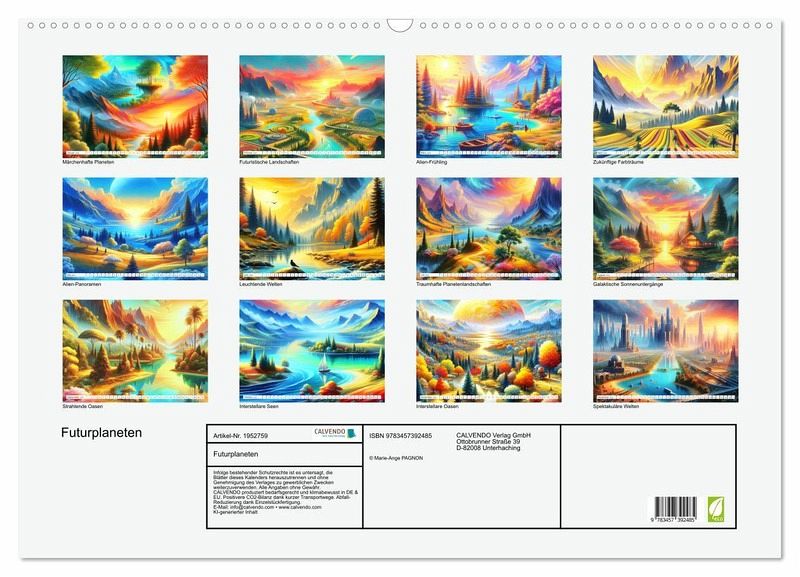QUALITÄT - Hochwertiger Fotokalender mit 12 wunderschönen Motiven auf lichtbeständigem Bilderdruckpapier, robuste Spiralbindung mit Aufhängebügel.NACHHALTIG - deutliche Abfallreduzierung durch bedarfsgerechte Einzelstückfertigung, umweltfreundliches FSC-zertifiziertes Papier, Produktion in Deutschland, klimabewusste Logistik.PERFEKTES GESCHENK - Kalender für Freunde und Familie, für Kinder und Erwachsene, jung und alt, zu Weihnachten, Geburtstag oder zwischendurch.VIELFALT - Bildkalender in verschiedenen Formaten, z.B. DIN A5, DIN A4, DIN A3 sowie DIN A2. Ob Naturmotiv, Gemälde oder Fotos, ideal für ein persönliches Wohlfühlambiente.Dieser einzigartige Kalender entführt Sie in die farbenprächtigen und futuristischen Landschaften fremder Planeten. von Autor(in): Marie-Ange Pagnon