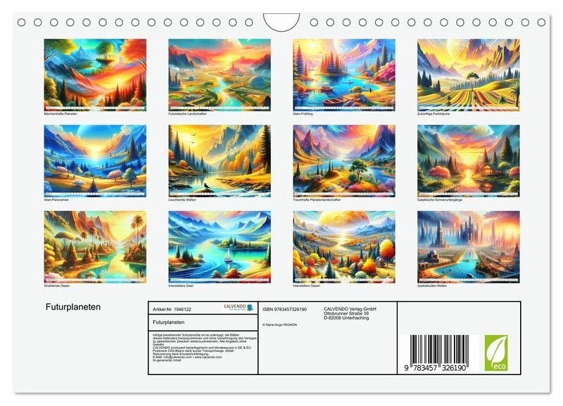QUALITÄT - Hochwertiger Fotokalender mit 12 wunderschönen Motiven auf lichtbeständigem Bilderdruckpapier, robuste Spiralbindung mit Aufhängebügel.NACHHALTIG - deutliche Abfallreduzierung durch bedarfsgerechte Einzelstückfertigung, umweltfreundliches FSC-zertifiziertes Papier, Produktion in Deutschland, klimabewusste Logistik.PERFEKTES GESCHENK - Kalender für Freunde und Familie, für Kinder und Erwachsene, jung und alt, zu Weihnachten, Geburtstag oder zwischendurch.VIELFALT - Bildkalender in verschiedenen Formaten, z.B. DIN A5, DIN A4, DIN A3 sowie DIN A2. Ob Naturmotiv, Gemälde oder Fotos, ideal für ein persönliches Wohlfühlambiente.Dieser einzigartige Kalender entführt Sie in die farbenprächtigen und futuristischen Landschaften fremder Planeten. von Autor(in): Marie-Ange Pagnon