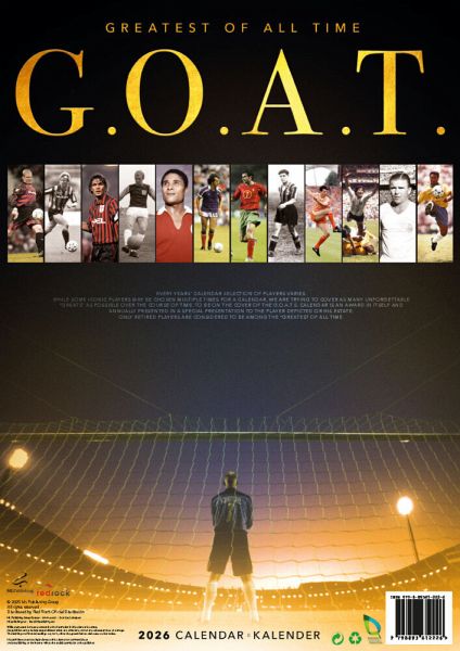 Der G.O.A.T.S. Kalender (Greatest of All Times) präsentiert jedes Jahr die größten Legenden des Fußball Sports. Von Alfredo DiStefano, Pele, Franz Beckenbauer bis zu Diego Maradona. Eine Jury honoriert jedes Jahr aufs Neue eine Auswahl der größten Majestäten des Sports. In streng limitierter Auflage. Der ultimative Fanartikel und Begleiter für jeden Fußball-Fan. In deutscher Sprache und inklusive aller gesetzlichen und religiösen Feiertage, Mondphasen, Kalenderwochen sowie einem breiten Nutzkalendarium zum Eintragen von eigenen Terminen, Geburtstagen und Notizen.
