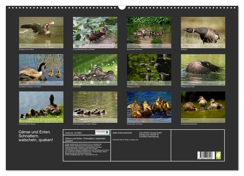 QUALITÄT - Hochwertiger Fotokalender mit 12 wunderschönen Motiven auf lichtbeständigem Bilderdruckpapier, robuste Spiralbindung mit Aufhängebügel.NACHHALTIG - deutliche Abfallreduzierung durch bedarfsgerechte Einzelstückfertigung, umweltfreundliches FSC-zertifiziertes Papier, Produktion in Deutschland, klimabewusste Logistik.PERFEKTES GESCHENK - Kalender für Freunde und Familie, für Kinder und Erwachsene, jung und alt, zu Weihnachten, Geburtstag oder zwischendurch.VIELFALT - Bildkalender in verschiedenen Formaten, z.B. DIN A5, DIN A4, DIN A3 sowie DIN A2. Ob Naturmotiv, Gemälde oder Fotos, ideal für ein persönliches Wohlfühlambiente.Schöne Wasservögel und bezaubernde Küken von Autor(in): Elisabeth Stanzer